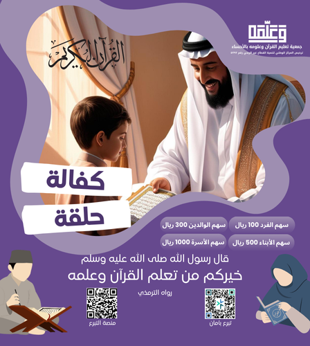 بكفالتك لحلقة تحفيظ، تساهم في تعليم كتاب الله، ليكون لك أجر كل حرف يُتلى، وكل قلب ينوَّر بنور القرآن